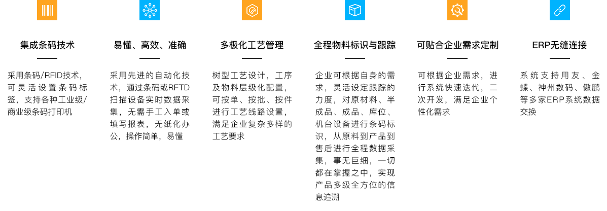 7. 实时、高效、准确地跟踪产品,在每道工序及每个质检环节的全过程,使企业具备更完善、更有竞争力的生产过程和品质管理能力。